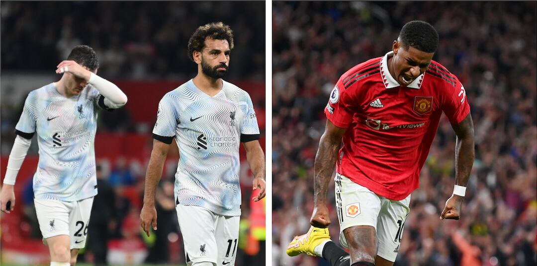 El Manchester United derrotó por 2-1 al Liverpool en un clásico del fútbol inglés entre dos equipos en dificultades, tras el que los Reds siguen sin conocer la victoria después de tres jornadas. Con Cristiano Ronaldo (que solo jugó los últimos minutos) y Harry Maguire en el banquillo, el equipo que entrena el holandés Erik ten Hag logró la victoria con los tantos de los internacionales ingleses Jadon Sancho (16) y Marcus Rashford (53).