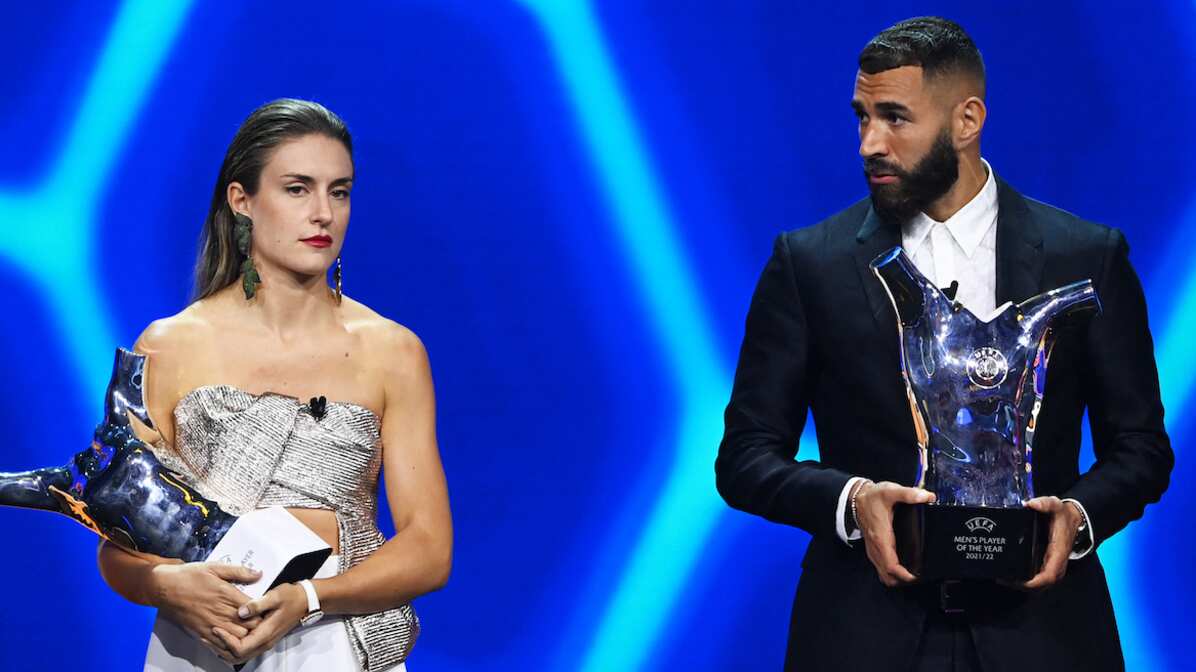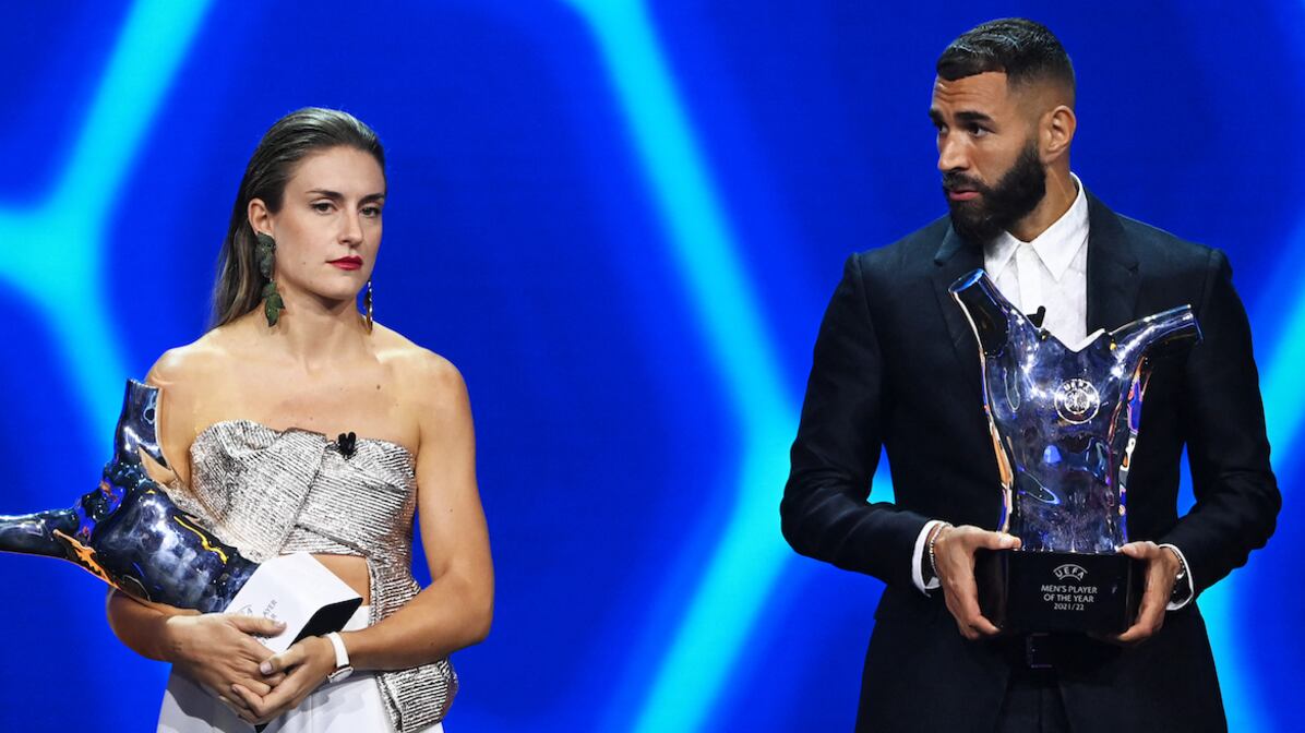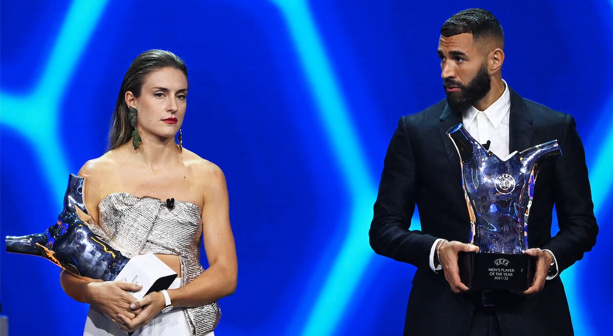 El francés Karim Benzema, brillante en el título de la Liga de Campeones con el Real Madrid, y la española Alexia Putellas, se alzaron este jueves con los galardones al mejor jugador y jugadora del año de la UEFA. Como antesala al Balón de Oro, el máximo galardón individual del futbol mundial que se concederá el 17 de octubre en París, Benzema subió al escenario en Estambul este jueves para recibir el primer gran trofeo a nivel individual de su carrera.