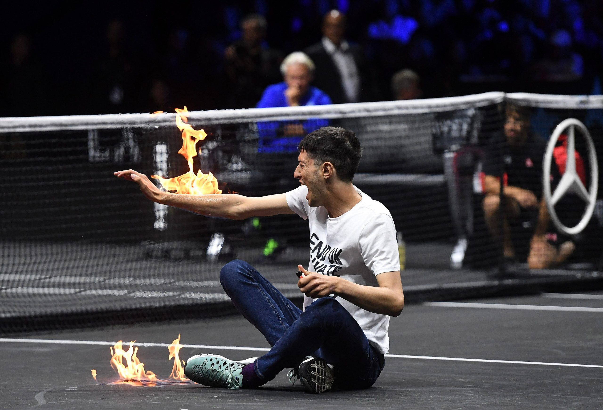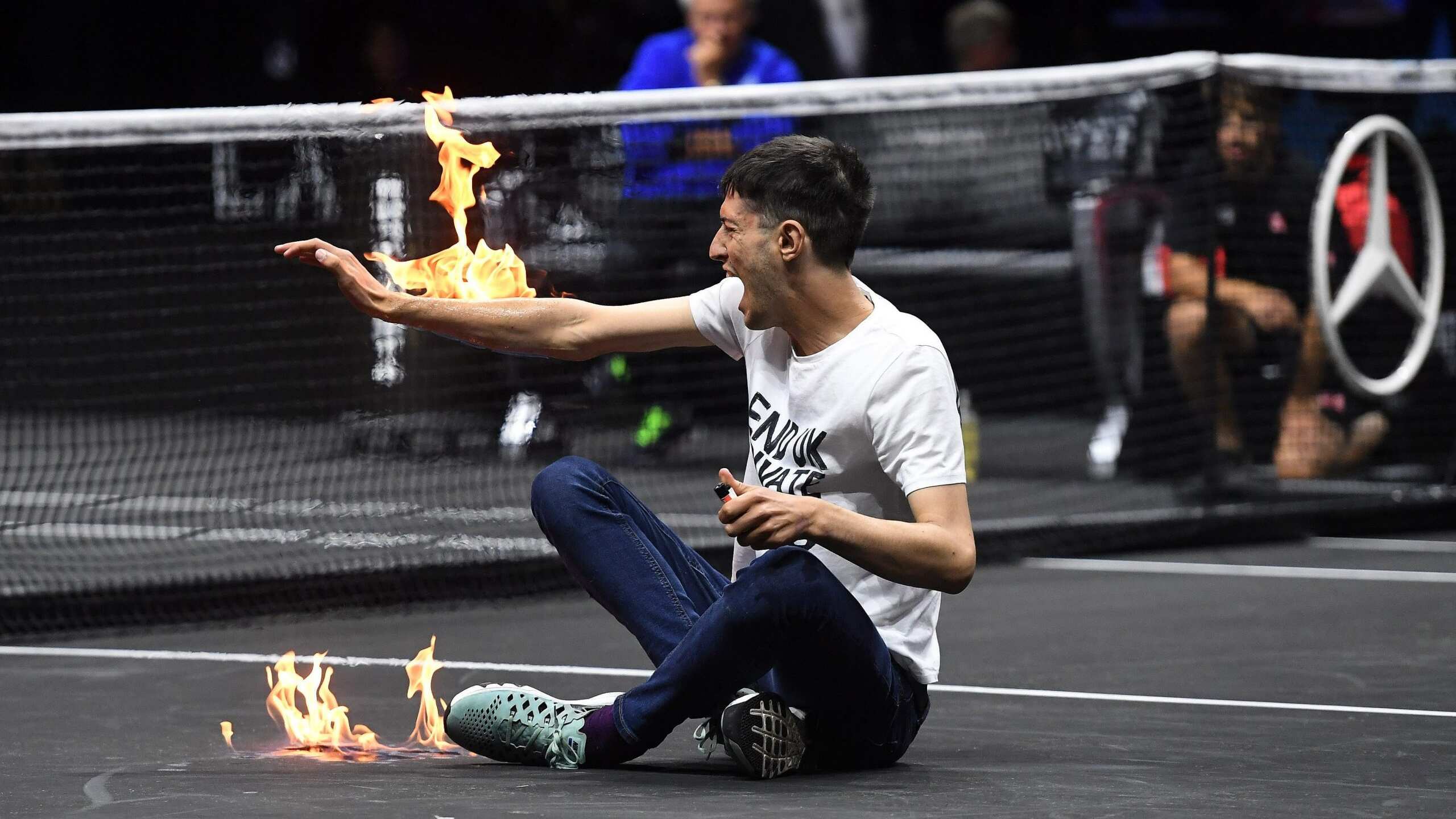 Se sentó en el medio de la pista y prendió una sustancia inflamable en su brazo, pero las llamas fueron rápidamente apagadas y el joven fue evacuado por la seguridad del torneo.