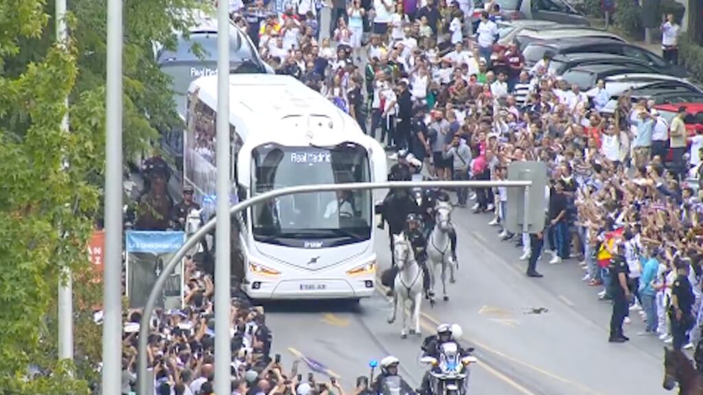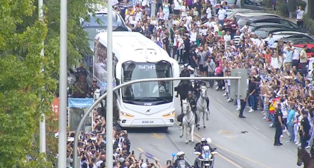 Con jinetes por delante, los jugadores del Real Madrid vivieron una descomunal bienvenida al Santiago Bernabéu. Miles de aficionados se congregaron, para recibir a los futbolistas, en un ambiente lleno de optimismo por conseguir el triunfo en el clásico español contra el Barcelona.