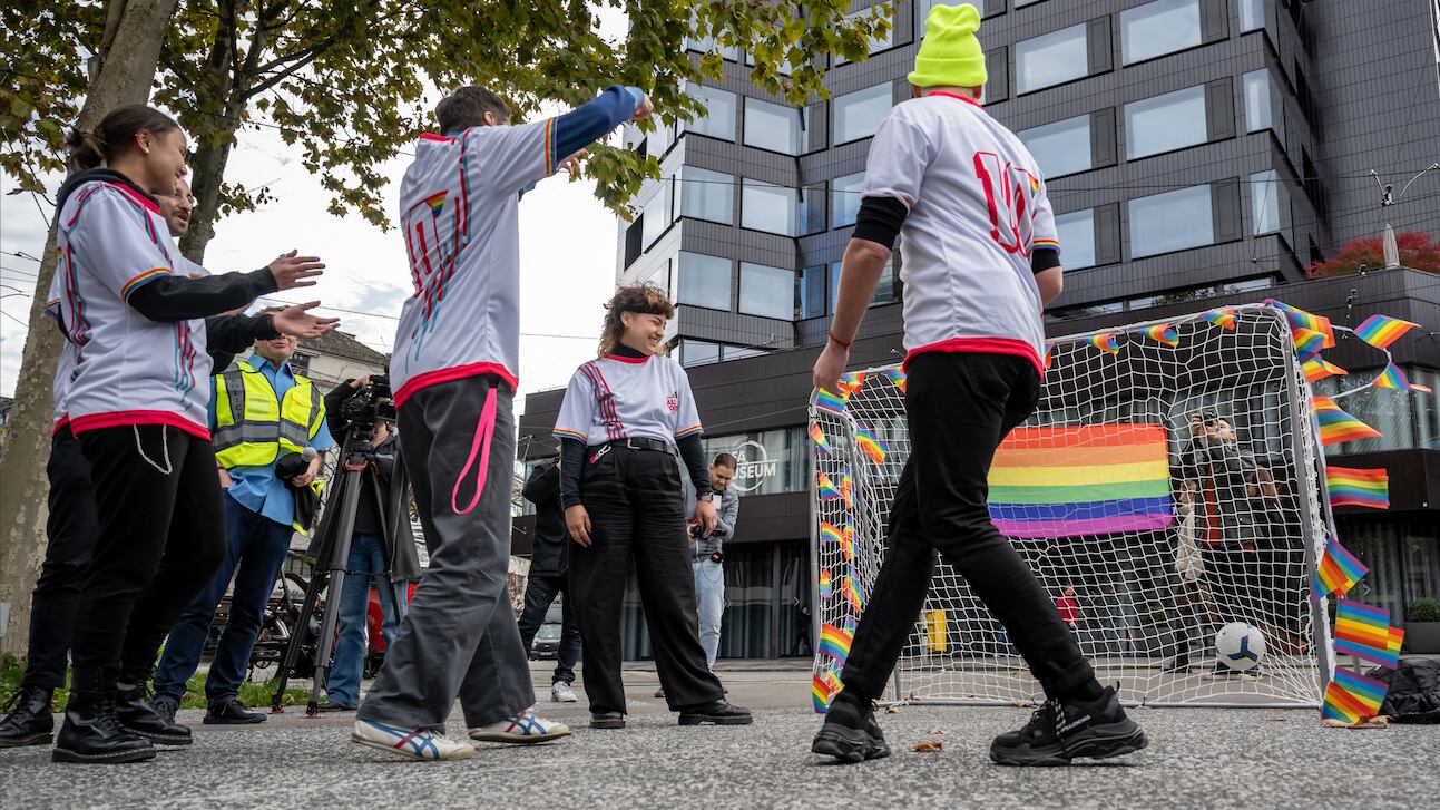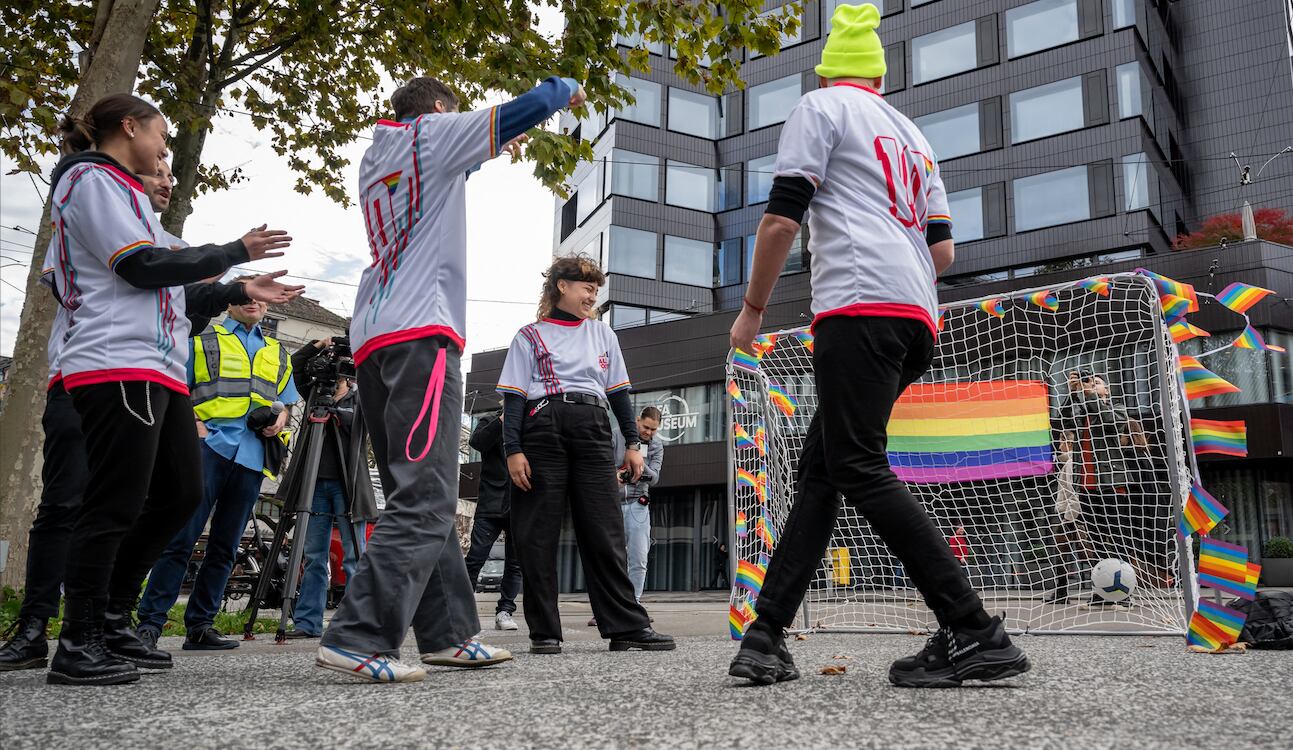 Varias organizaciones no gubernamentales jugaron un partido simbólico delante del museo de la FIFA en Zúrich como llamamiento para defender los derechos de la comunidad LGBT+ en la Copa del Mundo que comienza el 20 de noviembre en Catar, donde la homosexualidad es ilegal.