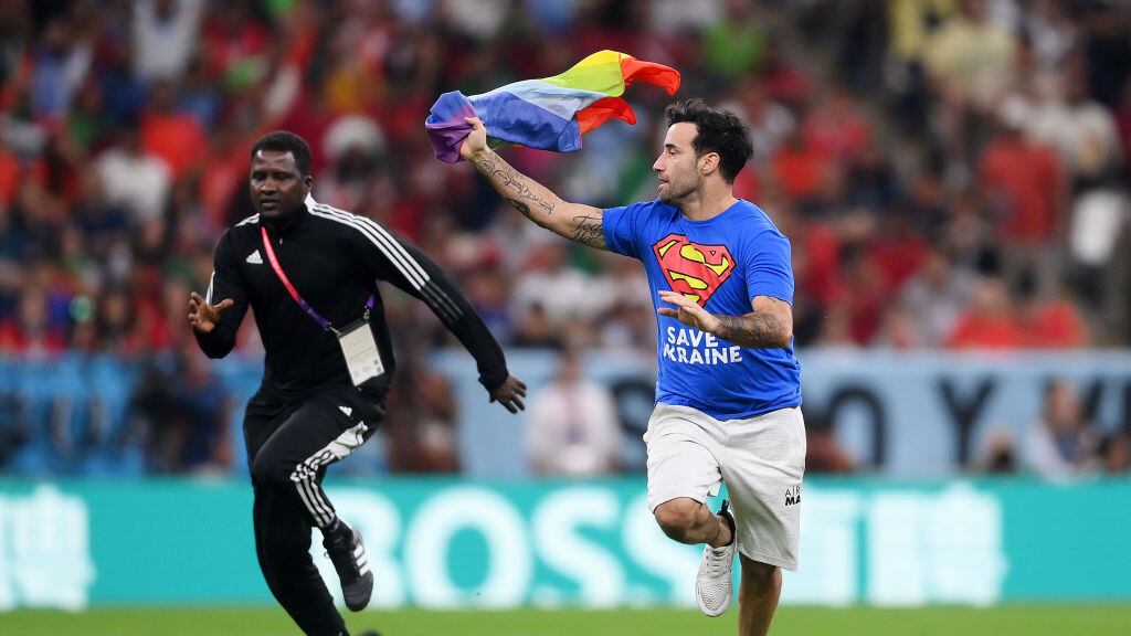El ciudadano italiano que atravesó el terreno con una bandera arcoíris y una camiseta de apoyo a las mujeres iraníes y a Ucrania, el lunes durante el partido Portugal-Uruguay del Mundial-2022, fue rápidamente liberado “sin consecuencias”, anunció este martes el Ministerio italiano de Asuntos Exteriores.