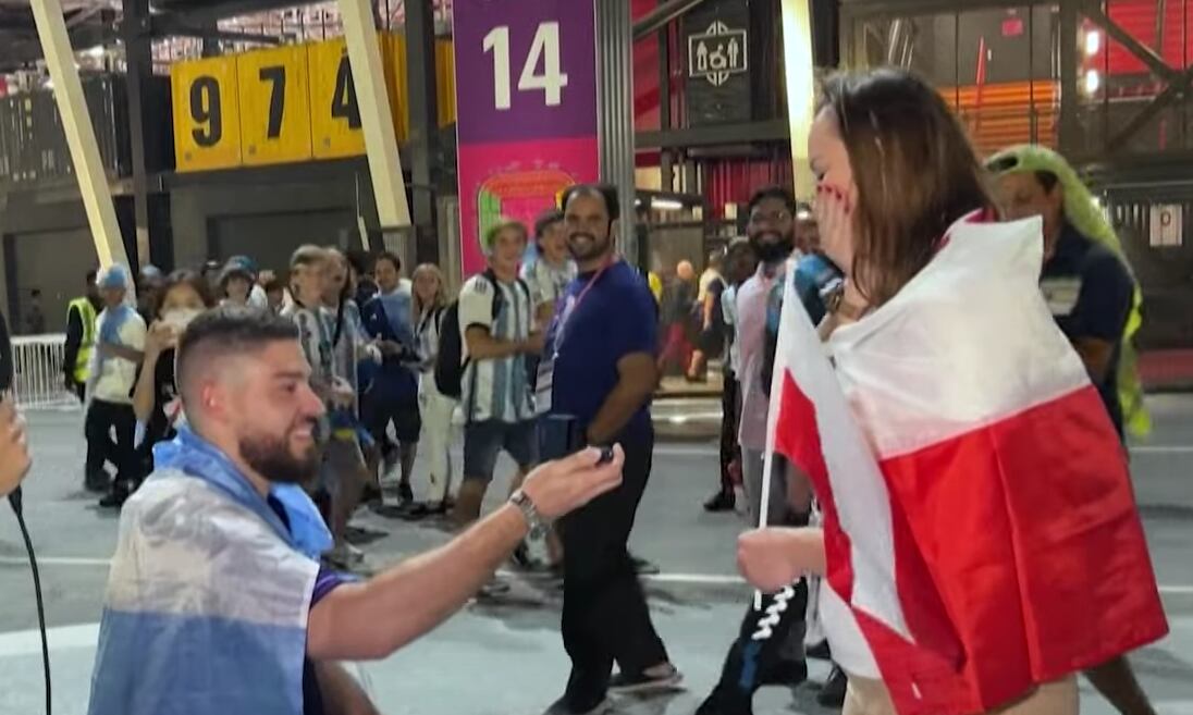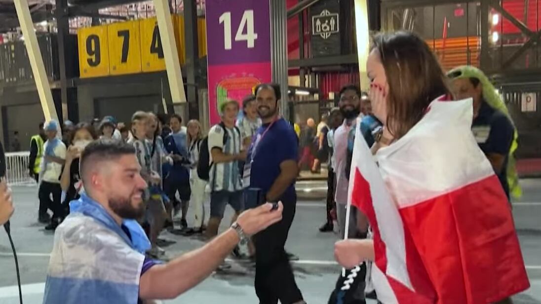 Minutos antes de que el partido de futbol entre Polonia y Argentina se llevará a cabo este miércoles en Catar, un aficionado argentino le pidió matrimonio a su novia polaca durante una entrevista televisada en vivo.