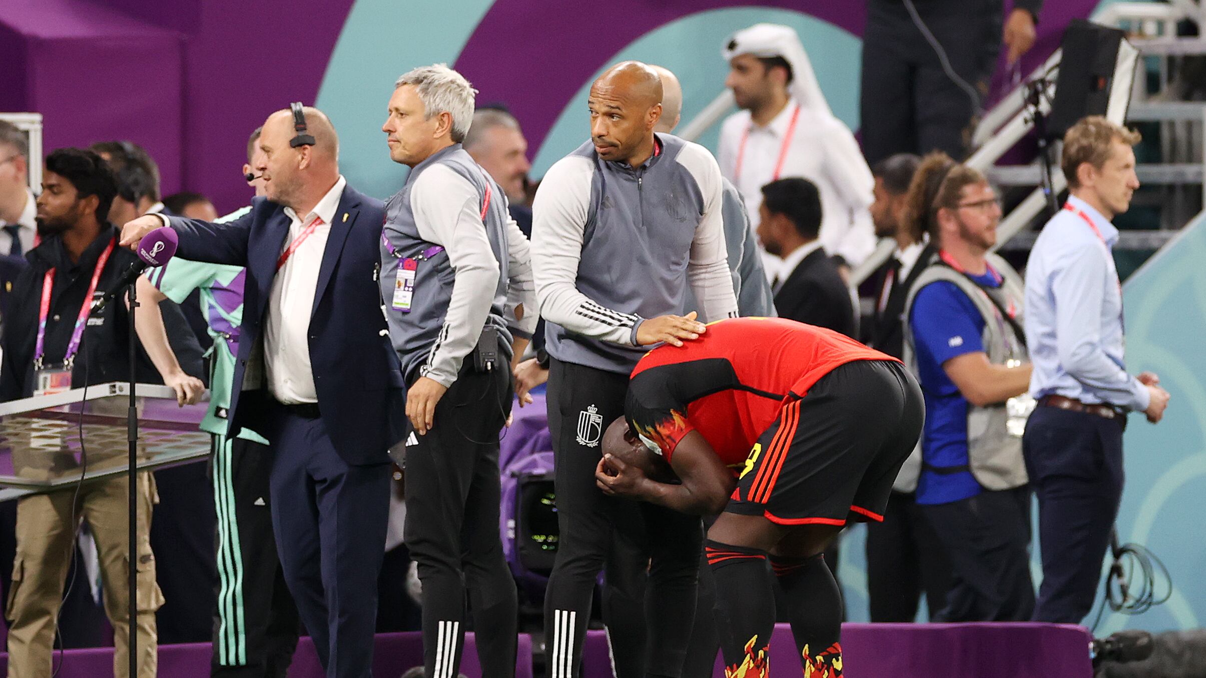 Entre los detalles emotivos se encuentra que no pudo contener las lágrimas y sobre el césped del Ahmed Bin Ali tuvo que ser consolado por Thierry Henry, miembro del cuerpo técnico de Roberto Martínez. El delantero francés le acogió como un padre y le ayudó a tomar la calma tras el batacazo.