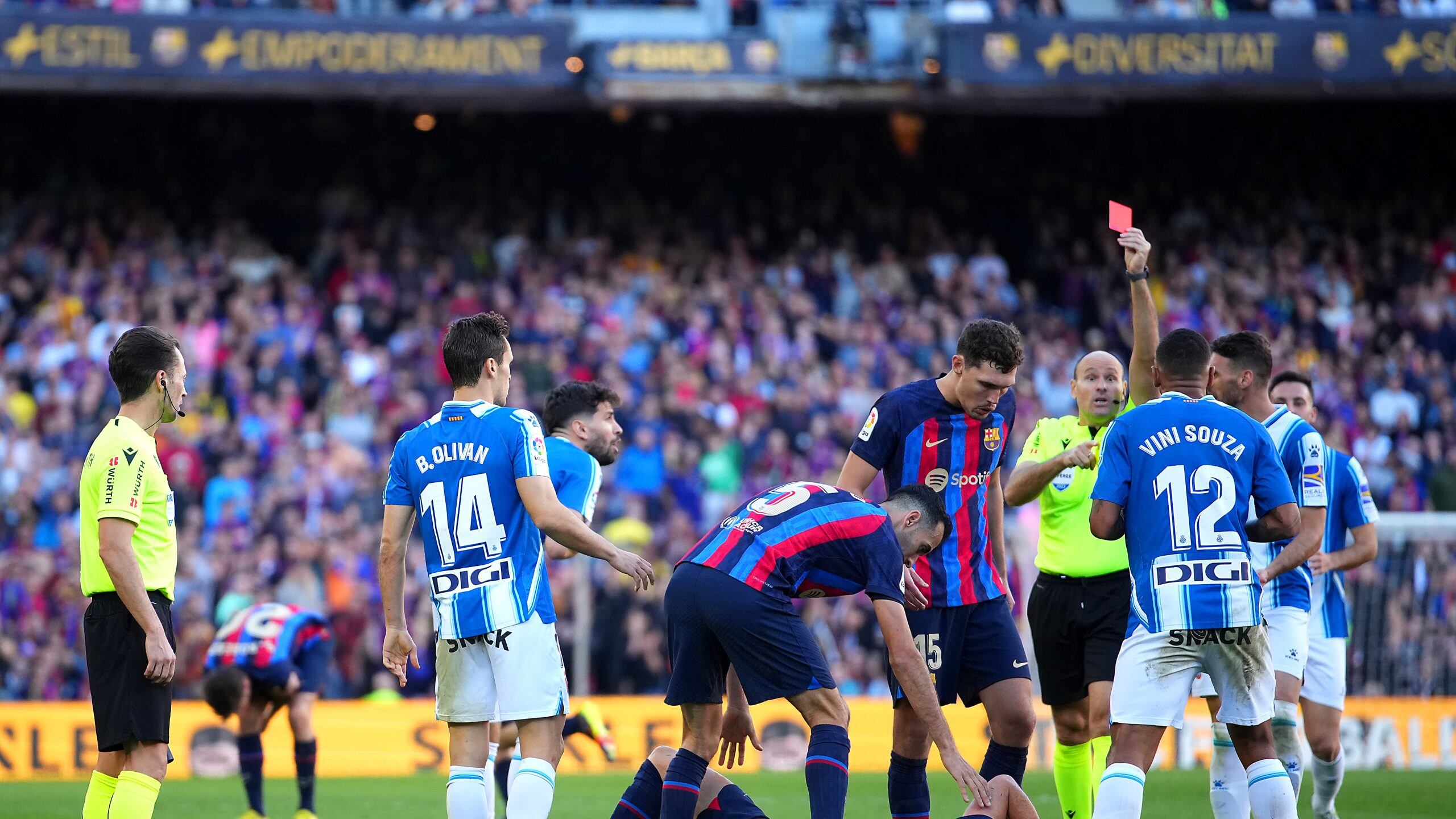 El juego siguió con interrupciones desde el penal cobrado en el 71′ y diez minutos después el Espanyol recibió las expulsiones de Vinícius Souza, por doble amarilla; y Leandro Cabrera, por roja directa; la expulsión de Cabrera fue revisada por Mateu Lahoz y fue anulada al 85′, por lo que ambos equipos quedaron con 10 jugadores.