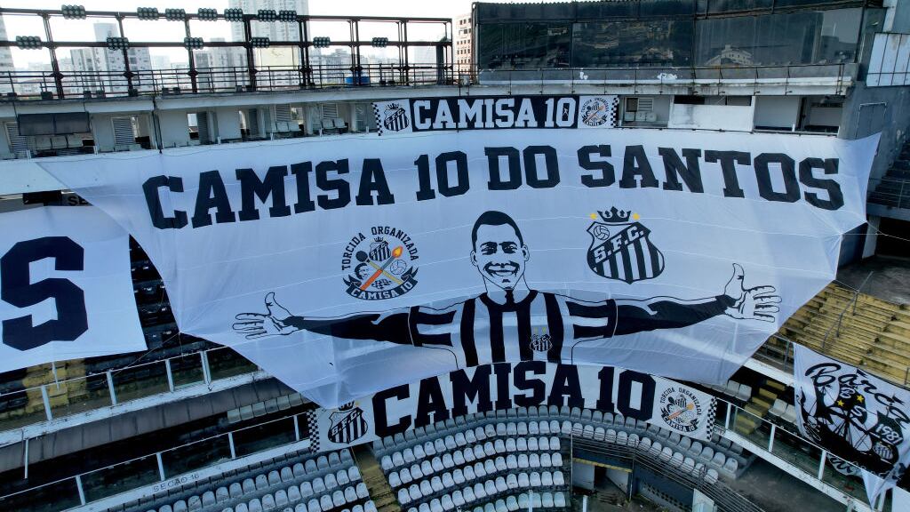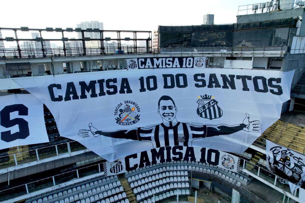 Varias banderas de diferentes tamaños decoran las tribunas: una con ‘O Rei’ de espaldas, mostrando la camiseta ’10’ que inmortalizó, y otras con los mensajes “Viva el rey”, “Pelé 82 años” o “Camisa 10 del Santos”.