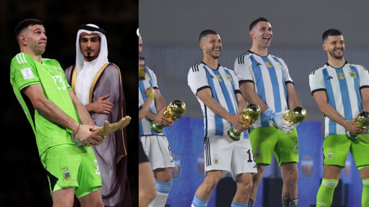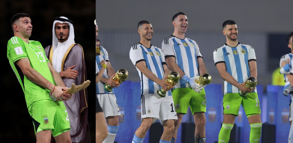 Emiliano “Dibu” Martínez emuló junto a Guido Rodríguez, Marcos Acuña Gerómino Rulli y Germán Pezzella su recordado y controversial festejo en las finales de la Copa América y del Mundial de Qatar 2022 con sus trofeos al mejor arquero pero ahora con la Copa del Mundo.