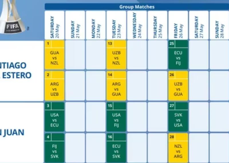 - Guatemala debutará debutará el 20 de mayo, enfrentará a Nueva Zelanda en el estadio Único Madre de Ciudades, posteriormente la Azul y Blanco se enfrentará a Argentina el 23 de mayo en el mismo recinto deportivo y finalizará su actividad en la fase de grupos enfrentándose Uzbekistán el 26 de mayo.