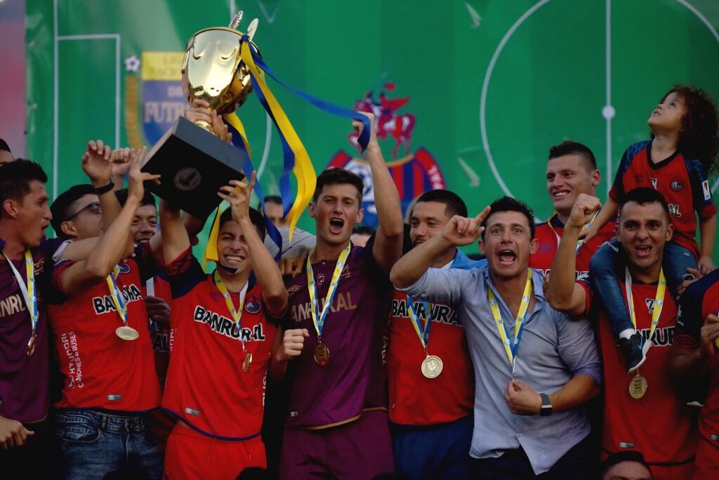 Players of Municipal and coach Sebastian Bini (2-R) celebrate on the podium with the trophy after winning the final of the Guatemalan Apertura football tournament against Antigua at the Doroteo Guamuch stadium in Guatemala City on December 29, 2019. (Photo by Orlando ESTRADA / AFP) (ORLANDO ESTRADA/AFP)
