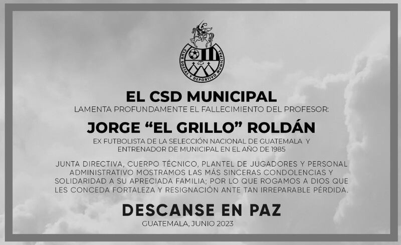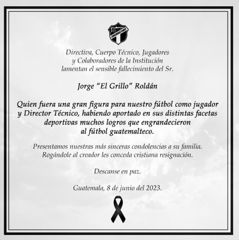 Por su parte, Comunicaciones, destaca que Jorge “Grillo” Roldán fue “una gran figura para nuestro futbol como jugador y director técnico”. El “Albo” recuera que Roldán aportó en distintas facetas deportivas “muchos logros que engrandecieron al futbol guatemalteco”. “Rogándole al creador les conceda cristiana resignación”, fue el deseo de la institución para la familia del “Grillo”.
