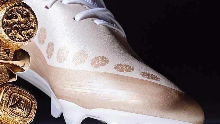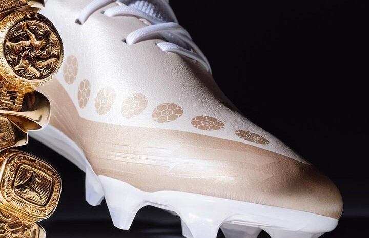 Los zapatos en una tonalidad combinada entre blanco y dorado, incluyen detalles que los hacen únicos, como una línea con ocho pelotas de futbol de color doradas, que hace referencia a los ocho Balones de Oro conseguidos por el hoy campeón del mundo (2009, 2010, 2011, 2012, 2015, 2019, 2021 y 2023).