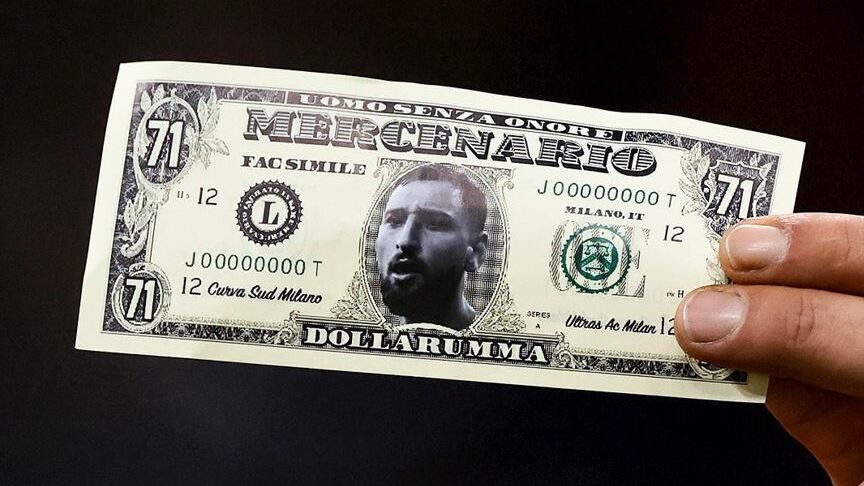 Los billetes llevaban su cara y una leyenda en grande que día “Mercenario”, además, el valor del dinero estaba representado con el número 71, el que significa: “Hombre sin valor” en la tradición napolitana. Es de recordar que Gianluigi Donnarumma es napolitano.