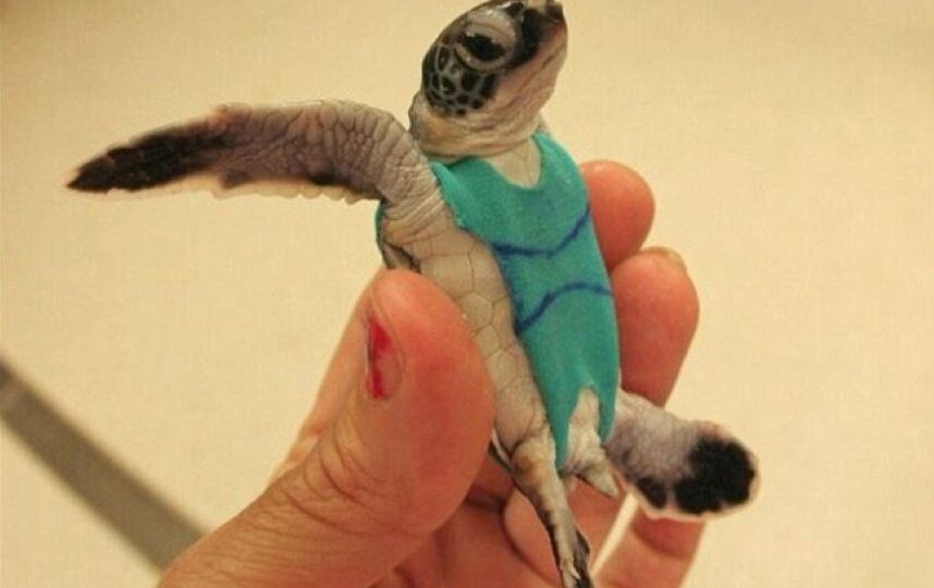 La vestimenta de las tortugas consiste en un “traje de baño”, el cual comienza como una camiseta, luego se corta de los lados y atrás, dejando un espacio para la cola y un colector desmontable para las heces.
