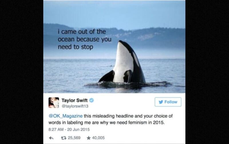 8. Porque en redes sociales es la mejor. Cuando la revista “OK! Magazine” sacó rumores sobre ella, les respondió: “Por esto necesitamos el feminismo en 2015”. Foto: Twitter/taylorswift