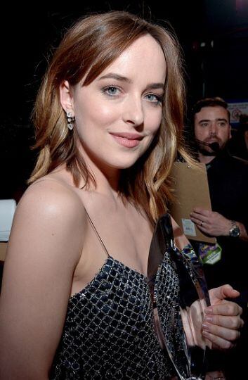 Con su trofeo en una mano y la otra en la espalda, Dakota Johnson se colocó con naturalidad frente al micrófono.