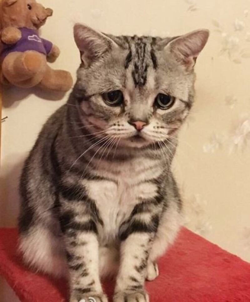 Esta expresión le valió ser llamado el “gatito más triste del mundo”, aunque de acuerdo con las imágenes de la cuenta de Instagram donde él se dio a conocer, vive rodeado de cariño y comodidades.