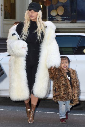 La socialité de 35 años uso un abrigo blanco hasta la rodilla, mientras que North West portaba un abrigo estampado de leopardo.