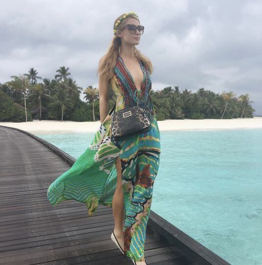 A través de su cuenta en Instagram, la socialité presumió el paradisiaco destino que eligió para festejar su cumpleaños y mostrar su esbelta figura en diferentes atuendos como: un vestido para la playa, un traje de baño con una piña de adorno y diminuto bikini color azul.