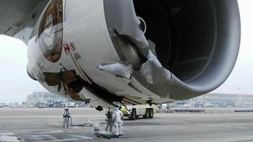 El accidente no solamente dejó destrozos en el avión, sino que también resultaron dos operarios heridos.