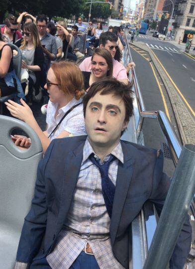 Durante su recorrido, el protagonista de “Harry Potter” iba a bordo de un autobús, asomándose junto a su “cadáver” para saludar. Sin duda una extraña, pero muy llamativa forma de hacer promoción a su nuevo trabajo.