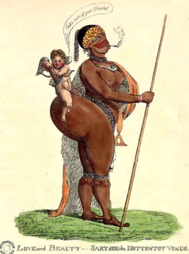 En el siglo XIX, existió una mujer llamada Sara Baartman, quien era de la etnia khoikhoi. Debido a una particular condición de las mujeres de su tribu llamada esteatopigia, en la que se acumula exagerada cantidad de grasa en sus glúteos, fue “notable” para su época, carente aún de rigor científico y sí de teorías racistas para probar la supremacía europea.