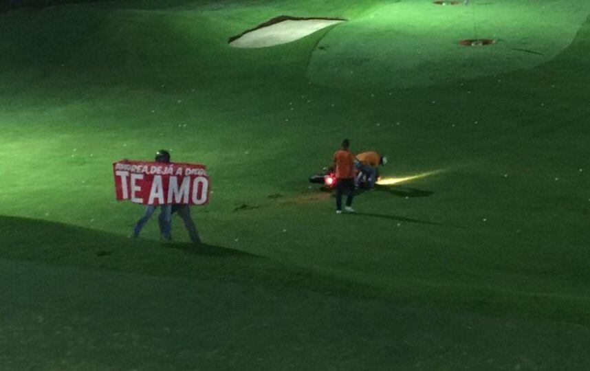 Un hombre irrumpió en el campo de golf montado en su moto ducati y mostró un cartel dedicado a una joven llamada Andrea.