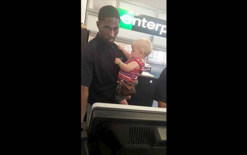 En la instantánea aparece John Goodlett, un empleado de una compañía de renta de vehículos cargando a un bebé mientras atiende Coty Vincent, la mamá del pequeño.