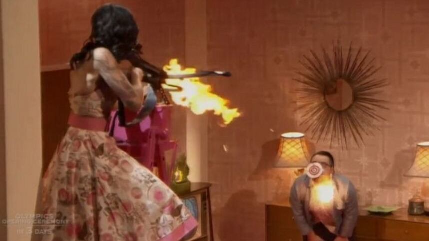 A Amber le falló la puntería y disparó la flecha contra el cuello de Ryan. En la transmisión del programa se pudo ver al hombre sacudirse la camisa y palparse la piel alarmado, debido a las llamas. Tras esto, Ryan se saca el tubo de la boca con menos elegancia de lo normal y alguien de seguridad aparece en el escenario para recoger la flecha caída.