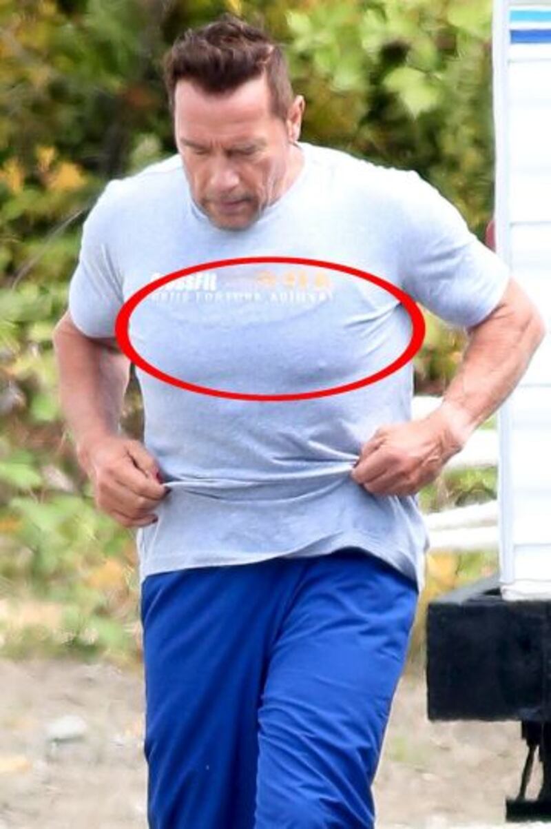 Como podemos ver en las fotos, debajo de su camiseta se remarca una prenda justamente a la altura de sus pectorales. Sin embargo, para muchos de sus seguidores Arnold solo usaba una camiseta de tirantes.
