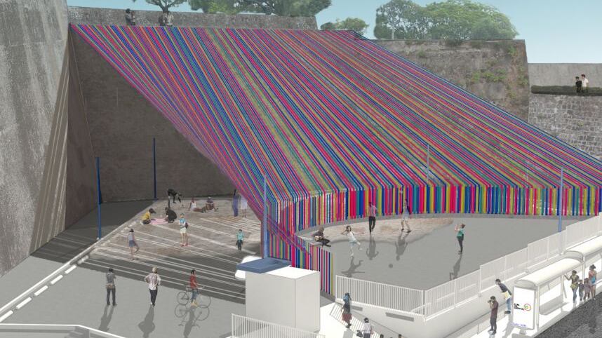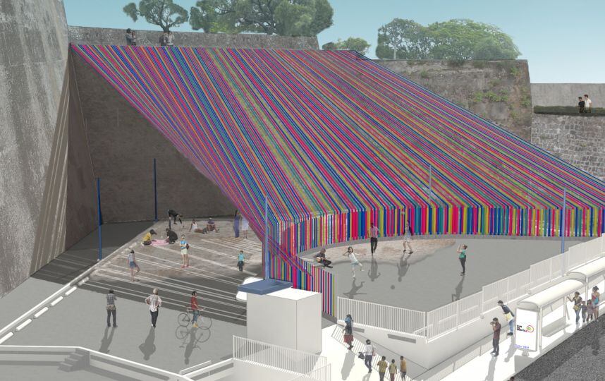 La Plaza de la Herradura, del Centro Cultural “Miguel Ángel Asturias”, se vestirá con los colores anaranjado rosa, azul y verde azul con el proyecto “playAchomo“, que instalará un techo gigante hecho de textiles sobre el muro de más de 20 metros de alto.
