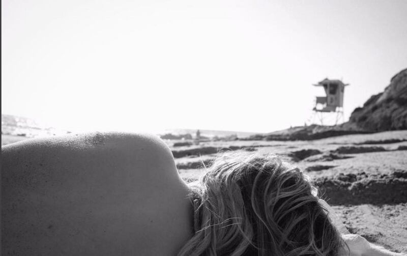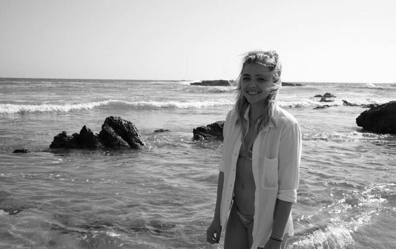 En la imagen blanco y negro podemos ver a Moretz recostada en la arena de una solitaria playa, con su cabello cayendo sobre su cuello y su espalda completamente descubierta. Esta postal fue tomada por su novio Brooklyn, quien es un gran aficionado a este arte.