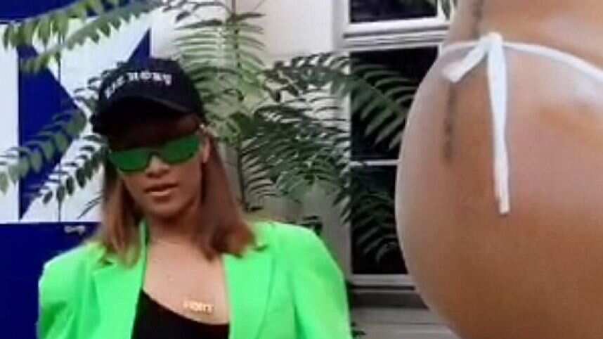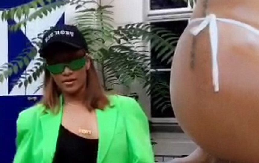 Rihanna vestía un conjunto de falda verdes fluorescente, unas medias y unas zapatillas negras de tacón además de una gorra de beisbol.