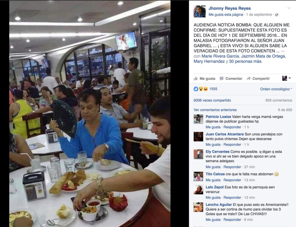 “Es mentira que Juan Gabriel ha muerto. Lo captaron en Malasia desayunando. Es 1 de septiembre. Otra vez al pueblo lo hacen creer y es mentira está vivo“.