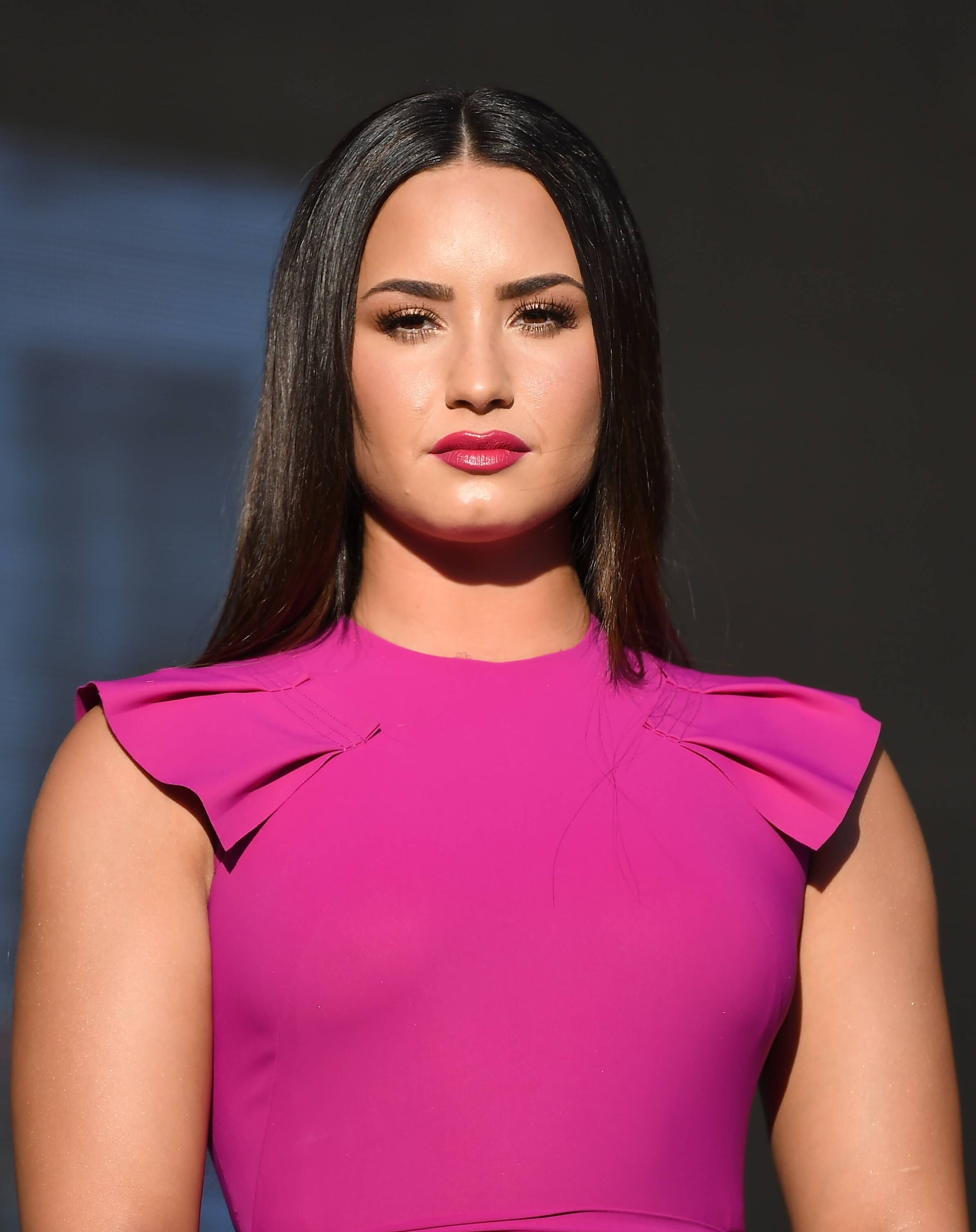 Demi completó su disfraz con un cabello largo, oscuro y alborotado con flequillo y los labios rojos.