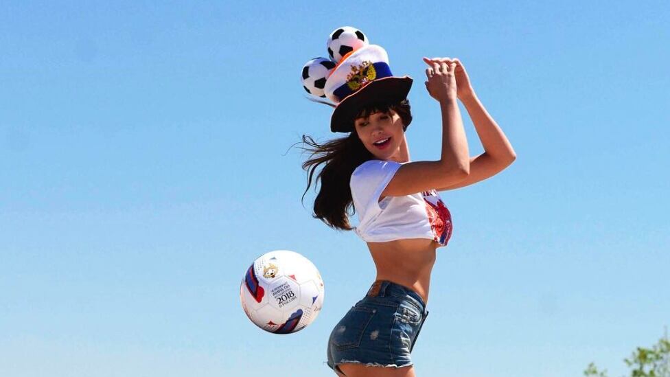 En las imágenes, la modelo aparece muy ligera de ropa, con la bandera de su país pintada en el rostro y con elementos que hacen alusión al futbol como balones y banderas, los cuales en ocasiones son los únicos que cubren sus partes íntimas.