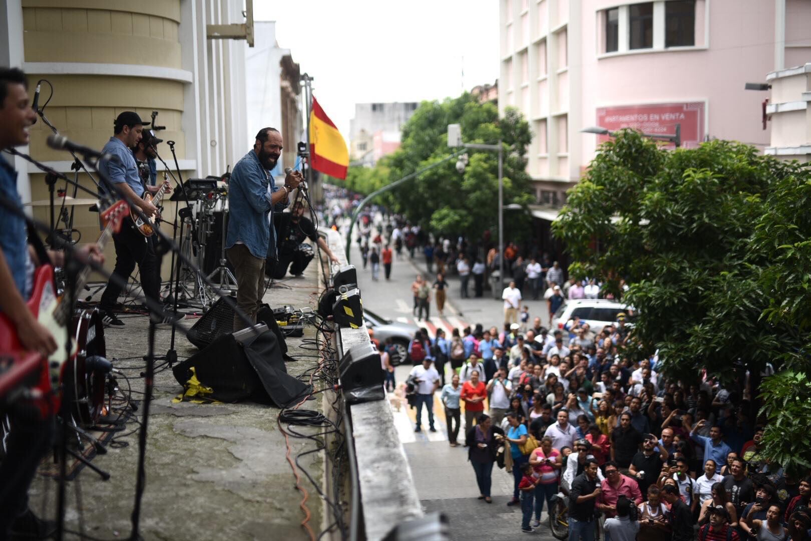 Decenas de personas se conglomeraron en el Paseo de la Sexta, frente al Centro Cultural de España, para disfrutar de la actuación de Bohemia Suburbana. La agrupación guatemalteca presentó desde la cornisa del Teatro Lux su nuevo disco: “Epopeya Sub”.