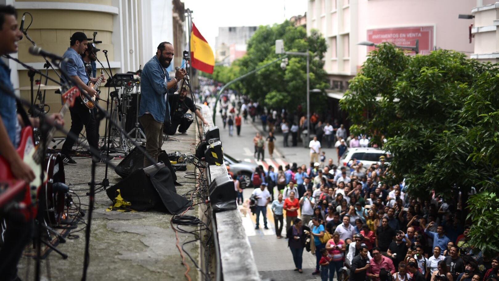 Decenas de personas se conglomeraron en el Paseo de la Sexta, frente al Centro Cultural de España, para disfrutar de la actuación de Bohemia Suburbana. La agrupación guatemalteca presentó desde la cornisa del Teatro Lux su nuevo disco: “Epopeya Sub”.