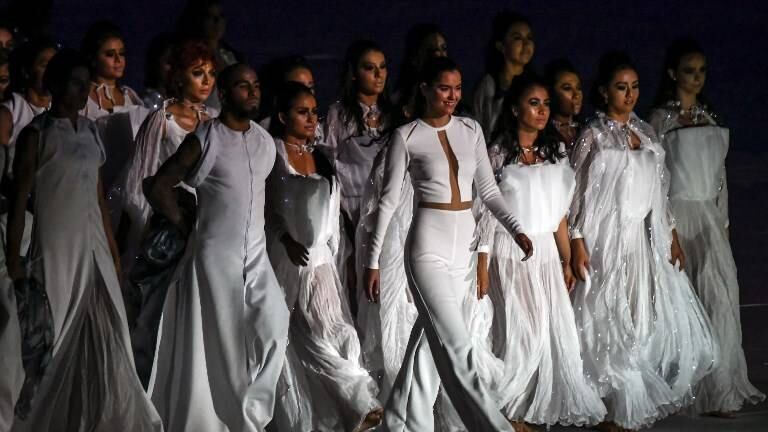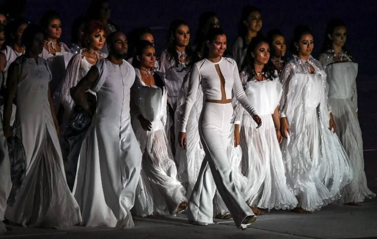 La joven modelo estuvo acompañada de un séquito de bailarinas, quienes la acompañaron durante su actuación en el Estadio Metropolitano de Barranquilla.