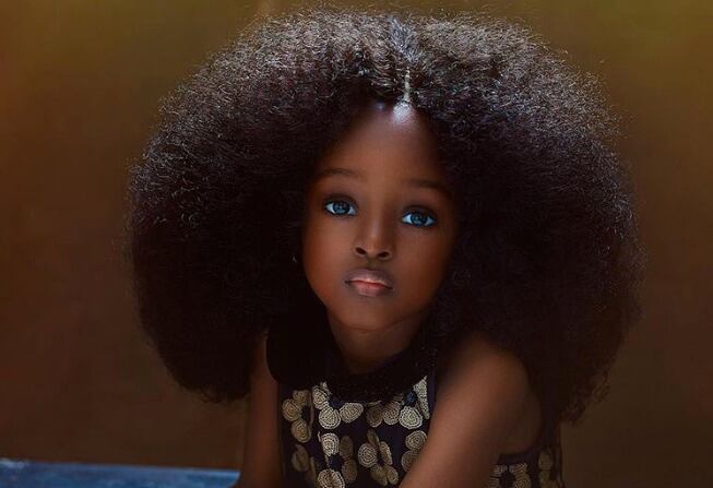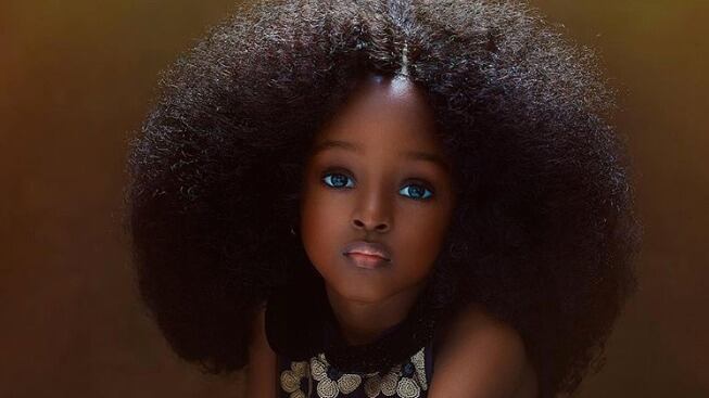 La pequeña se muestra posando en un entorno simple que muestra sus enormes ojos y su piel perfectamente lisa, así como su impresionante cabello afro.