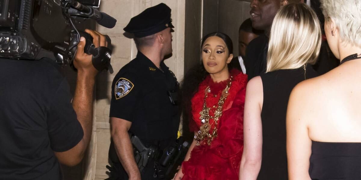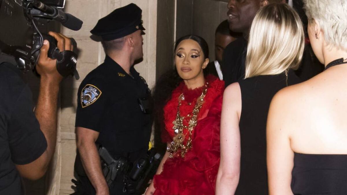 Cardi B, vestida con un voluminoso vestido rojo de Dolce & Gabanna, fue vista saliendo de la fiesta con lo que parecía ser un golpe en la cabeza. Iba descalza.