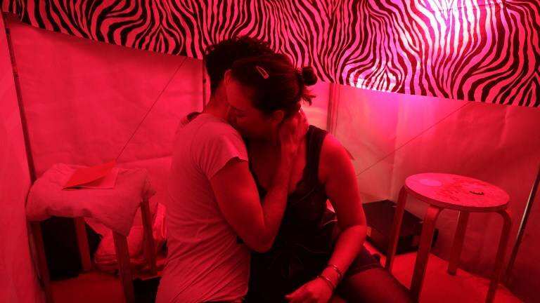 El suizo Daniel Hellmann instaló una tienda en el festival con la leyenda "servicio completo", y promete en el interior, lejos de las miradas y contra un pago, "todo tipo de servicios".