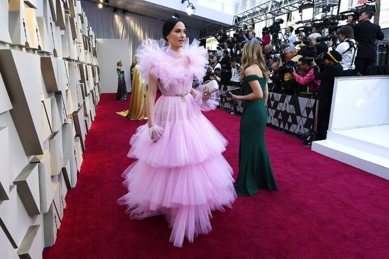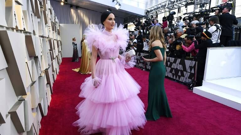 La actriz de 43 años de edad caminó por la alfombra roja con un vestido rosa con volantes, junto con Octavia Spencer, en apoyo de "Green Book", que está en la categoría de Mejor Película.
