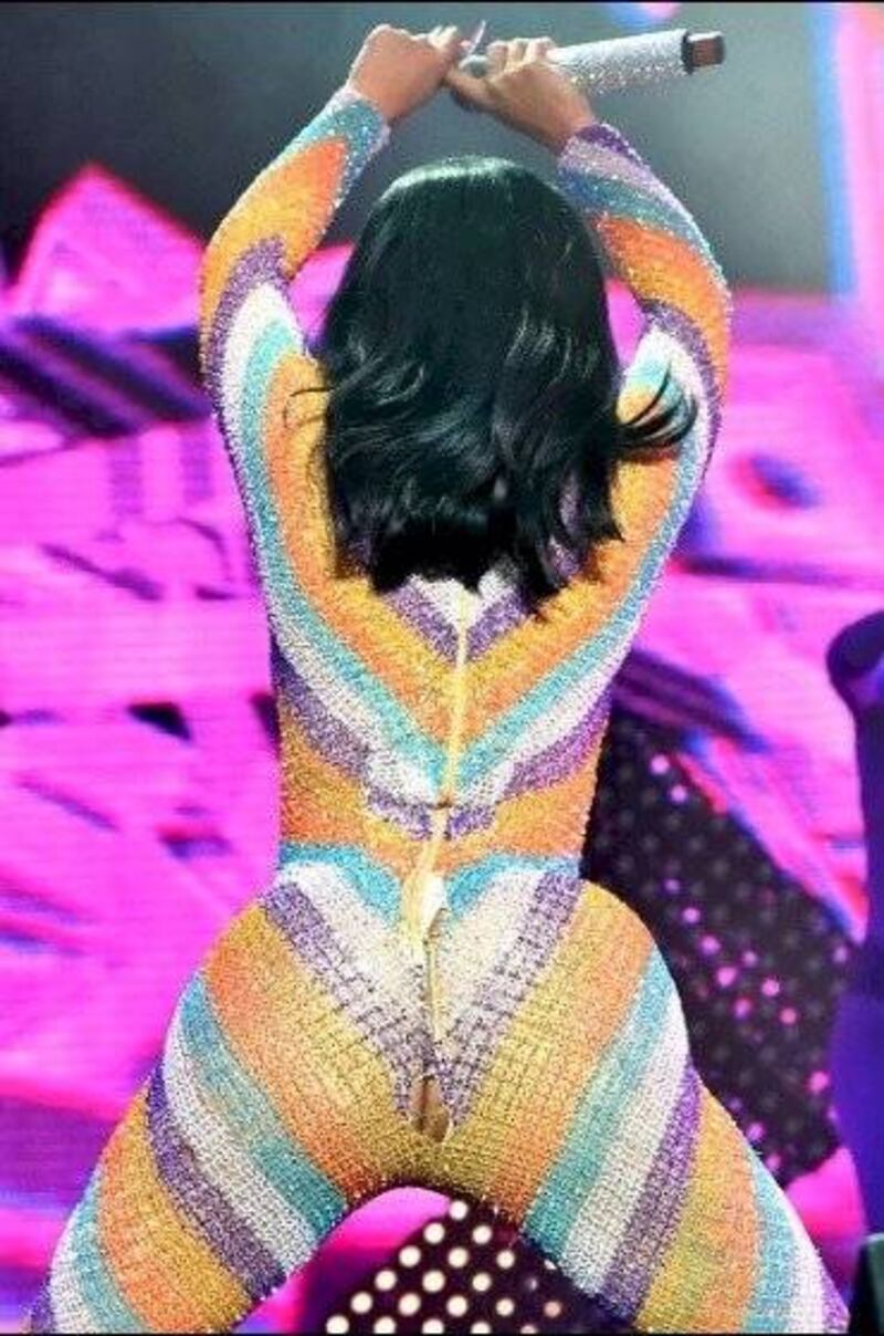 Poco minutos llevaba cantante, y dada su exuberante figura en contraste con un apretado traje, la mujer de "I like it" rompió su vestido justo en las costuras del trasero.