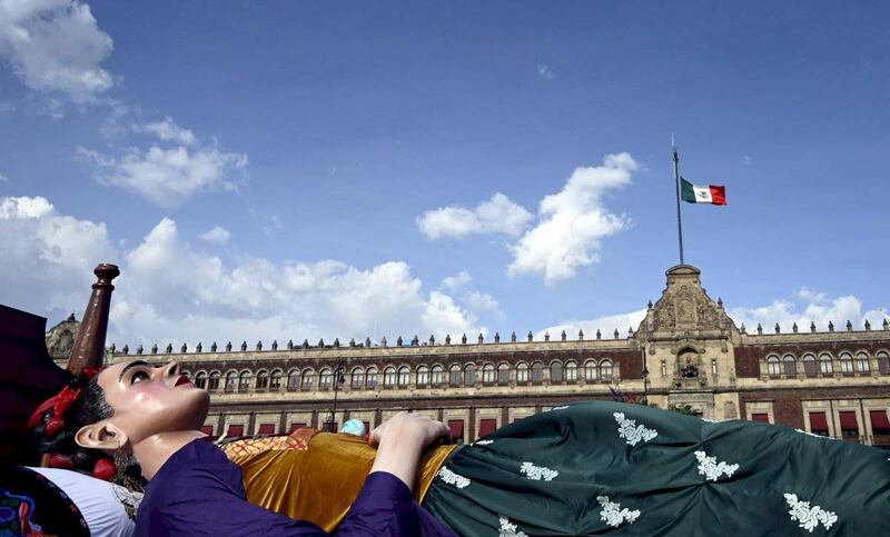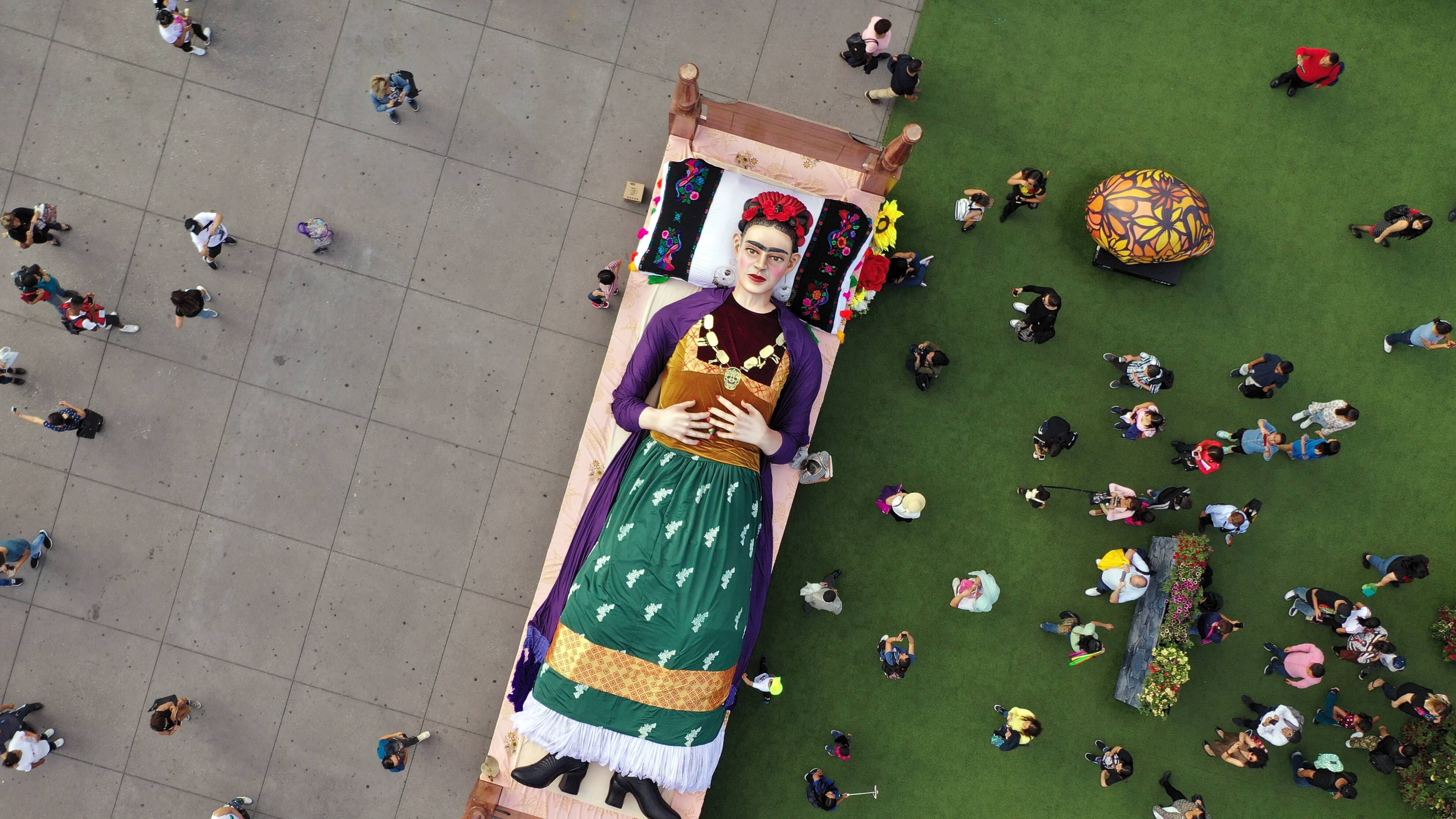 Una enorme figura de Frida Kahlo postrada en una cama robó la mirada de cientos de mexicanos y turistas en la plaza central de la Ciudad de México.