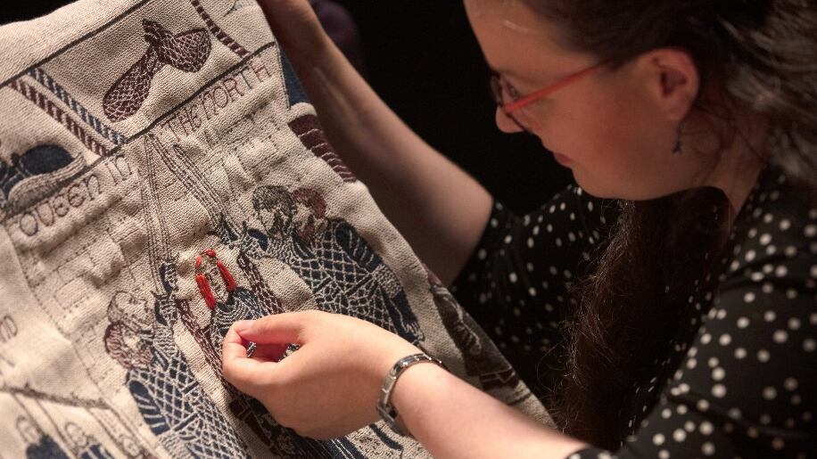 Estará junto a la célebre tapicería de Bayeux, de la que imita el estilo, y que relata la conquista de Inglaterra en el siglo 11, a lo largo de 70 metros de bordados.