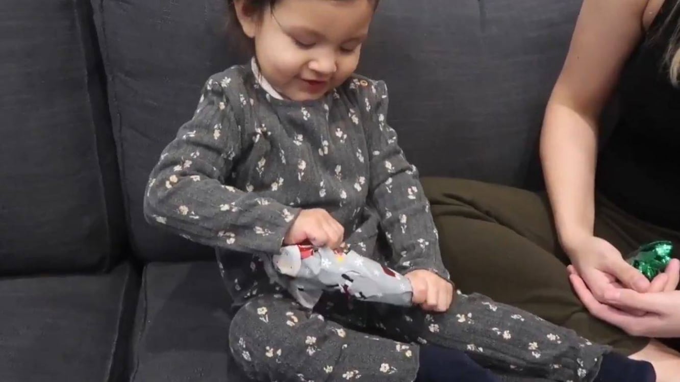 Después de lograr abrir el regalo, la niña le pide a su mamá que le quite la cáscara, sin dejar de gritar por la alegría, la pequeña come la fruta en ese mismo instante.