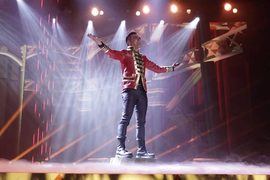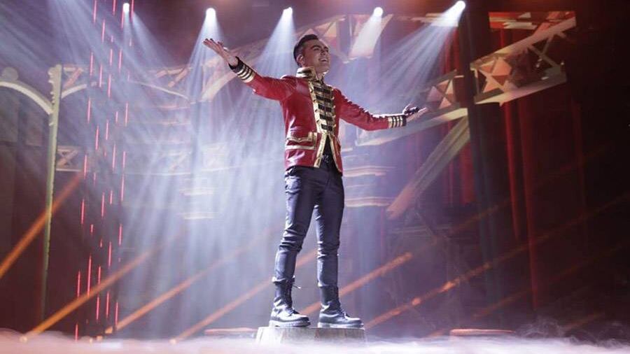 Dennis se plantó en el escenario con un atuendo rojo y una escenografía muy circense.