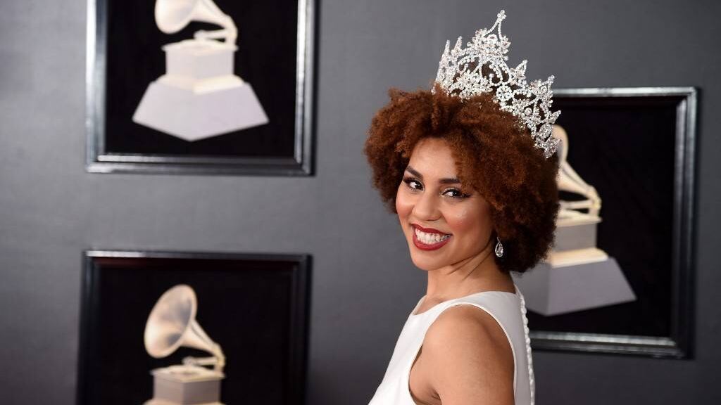 Tanto el atuendo como el abrigo blanco fueron confeccionados con tela deportiva de malla blanca que una compañía donó a diseñadores en Portland, según dijo la intérprete.