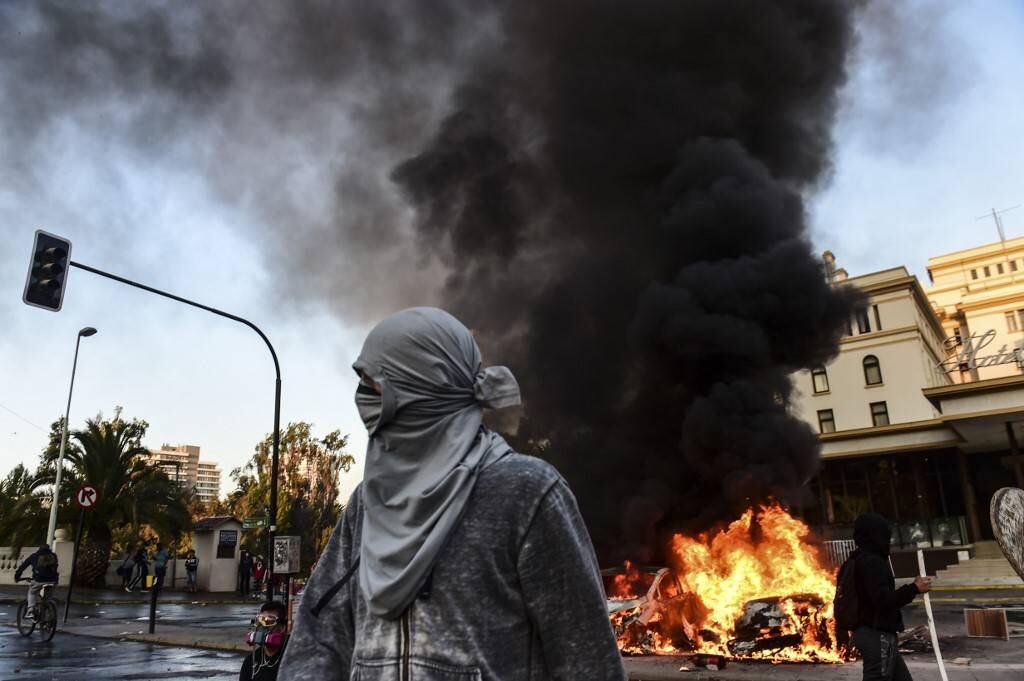 Decenas de encapuchados lanzaron piedras y rompieron los enormes ventanales del frontis del edificio, tiraron bombas molotov y gases lacrimógenos de la Policía al interior del vestíbulo. También quemaron al menos siete vehículos.