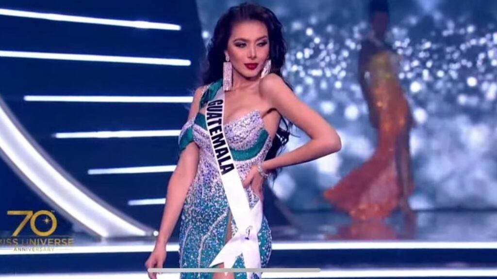Durante el evento que se transmite en línea, la Miss Guatemala lució un elegante vestido de noche y un bikini en color corinto.